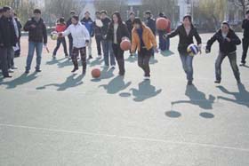 趕小豬游戲中,我們的女同胞們拍起籃球來個個英姿颯爽
